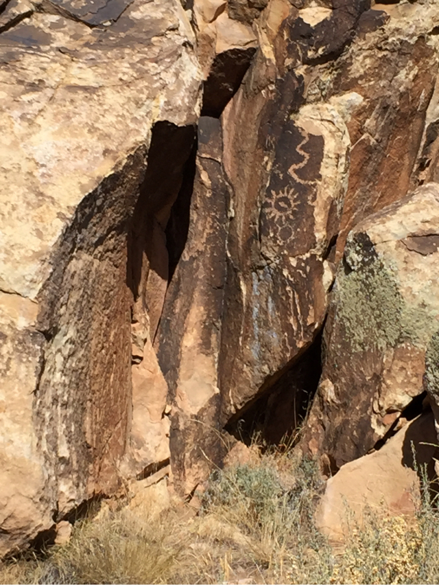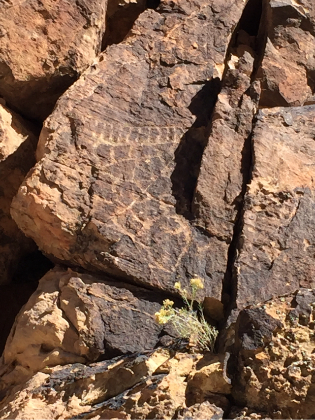 Petroglyphs are like ancient newspapers. They can be older than 300 BCE here in the American Southwest. Although the people who made them had no written language, some symbols were universal. Some of these drawings are art and some have meaning as astronomical calendars. The zipper glyph has been overlayed over an area topo map and matched the position and altitude of the mountains in sight.